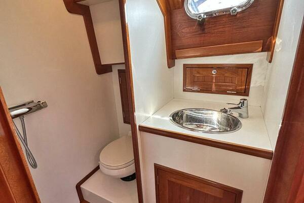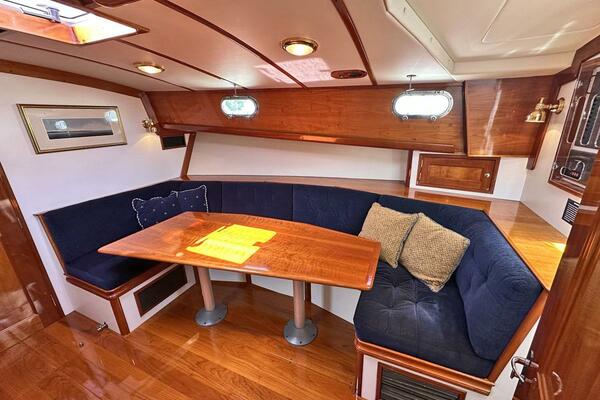 Befitting a high-caliber Maine-built boat, the cabin sole is constructed of solid wide-planed cherry with a gloss finish. Off white overheads with cherry accents and dome lights are found throughout the interior.