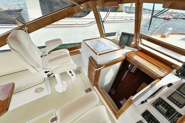 The entire bridge deck can be lifted hydraulically to provide access to the engine room. The windshield is a thing of beauty; a custom varnished teak 3-panel design with center opening panel and pantograph style windshield wipers with Exalto intelligent controls. Sailboat style companionway with teak sliding hatch and bi-fold doors. Helm to starboard with twin Stidd pedestal chair. Across to port is Stidd companion pedestal chair and navigator’s desk. Both Stidds recovered in Ultraleather 2025.