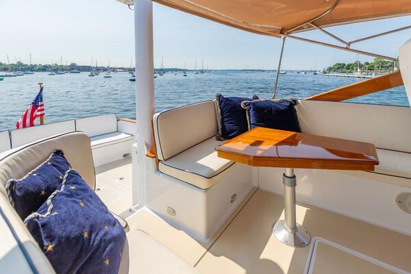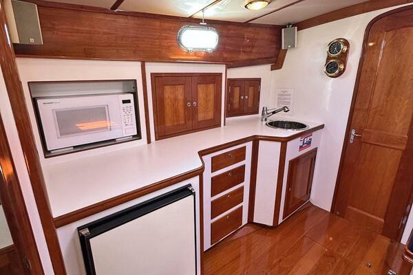 The cockpit features a built-in athwartship transom settee w massive solid teak backrest with storage beneath and a custom wetbar with large insulated ice box, stainless sink and cabinet storage. Generous L-shaped teak steps which are large enough to sit on provide access to the raised bridge deck as well as the side decks. Raised gunwales with varnished teak caps run the length of the cockpit for additional protection from any spray or water than makes it onto the deck.