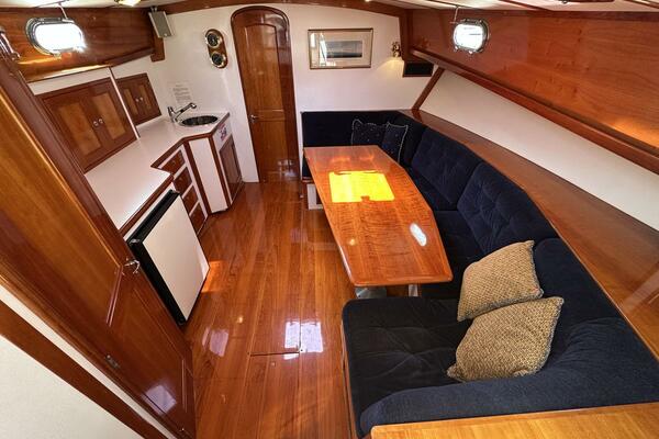 Aft to port is a generous L settee with storage beneath and custom convertible teak table. Across to starboard is a straight settee with storage beneath. Both settees have solid teak backrests.