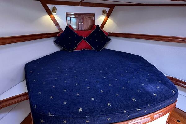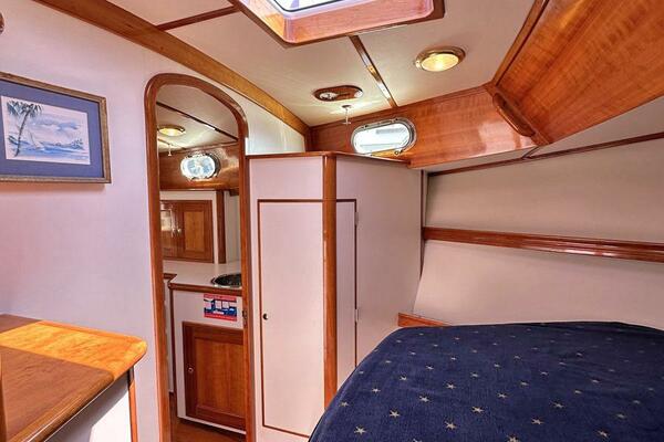 Forward is a generous private stateroom with centerline berth, large hanging lockers and cabinet with built-in TV. Two opening ports and large opening overhead hatch and dorade vents with sliding covers provide light and plenty of ventilation to augment the AC/reverse cycle heating. Shelving is provided along each berth, with storage beneath.