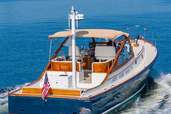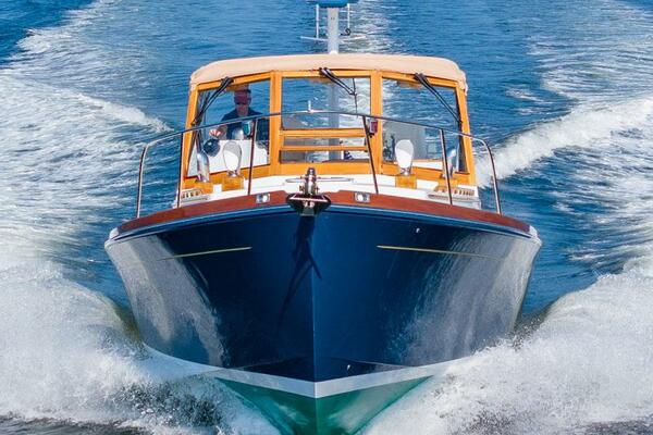 The Morris Wolf Class 44, one of the finest designs to spring from the boards of Paine Yacht Design, redefined the contemporary Maine express cruiser. Not a replica: she has sweeping lines, a distinctive profile and a smooth-riding hull. This 44-footer's Downeast origins are evident in the long, graceful profile and prominent, upturned bow- reminiscent and reflective of earlier Bunker and Ellis woodies built on Mount Desert Island years ago. The hull shape, however, is fully modern with a warped "V" with a very fine forward entry for wave penetration that flattens out to a 7.5 degree deadrise angle at the transom with “hard” chines to prevent roll and a partial skeg to provide excellent tracking as well as protection for the running gear. The result is better performance and fuel economy at lower speeds than a true deep "Vee” hull and a very smooth and capable ride at 27 knots when the going gets tough.