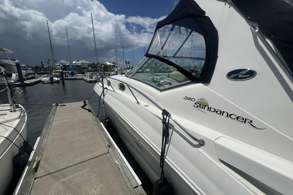 The 2003 Sea Ray 320 Sundancer has an overall length of 34.4 feet. It boasts a sleek modified Vee hull made of durable fiberglass, ensuring a smooth ride on the water. Powered by twin 320 HP MerCruiser 350 EFI engines, she a cruises at a speed of 28 mph, and a maximum hull speed of 36 mph.