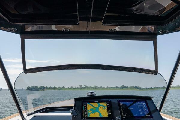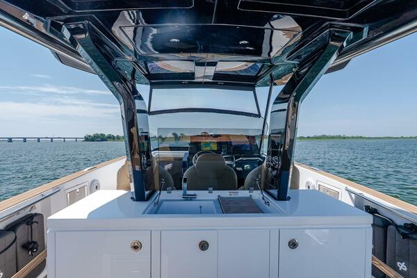 With many desirable options including FLIR, sureshade electric shade, stabilizer, and skyhook, this P38 will turn heads in any harbor she enters thanks to her striking carbon black T-top against her clean white hull and triple Mercury 300HP engines.