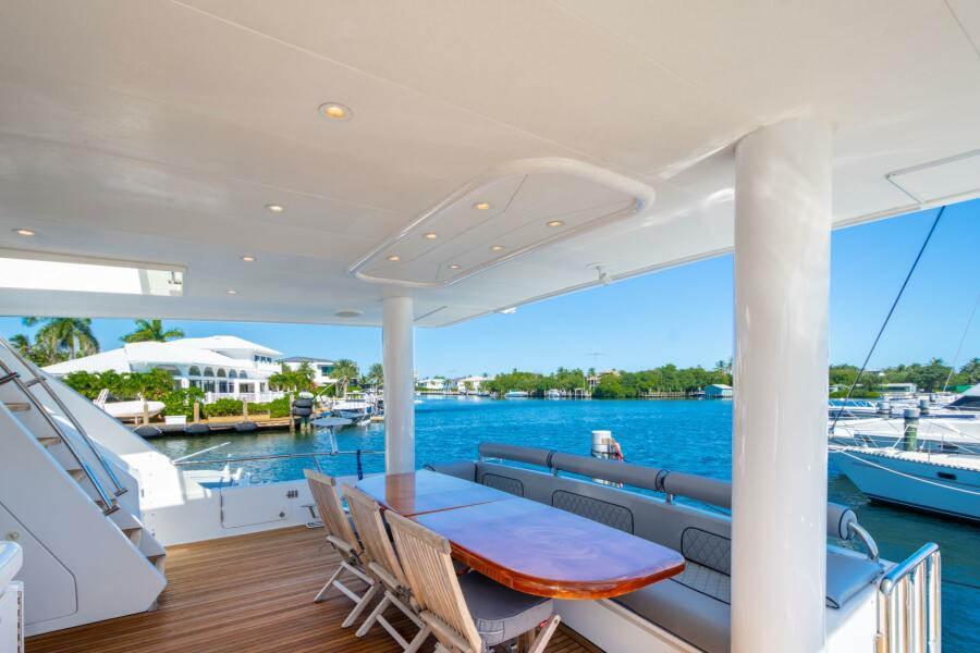 From the custom teak aft deck, you enter a welcoming main salon through automated glass doors. The space feels intimate yet open, arranged with multiple seating areas that make entertaining effortless. Forward, the Hargrave “country kitchen” brings the galley and dining together, with a large aft-facing banquette and day head to starboard.