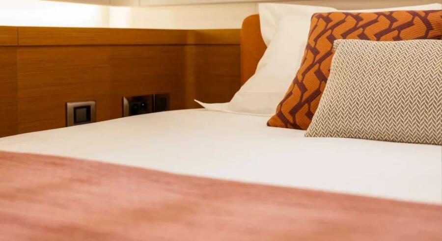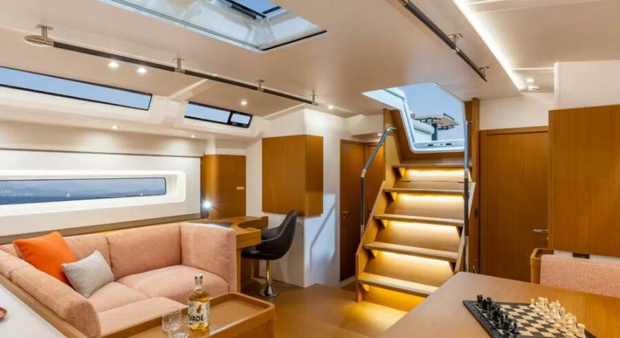 The interior of the FIRST 60 is a masterclass in spacious, refined design, meticulously crafted to maximize comfort and enjoyment during life at sea. Below deck, the layout is both luxurious and practical. A welcoming dining area sits opposite the dedicated owner's corner, which features a comfortable sofa and an oversized navigation table. The full-beam galley is designed for effortless efficiency while sailing, boasting an elongated worktop and cleverly integrated storage solutions. The owner's cabin is a true sanctuary. It is bathed in natural light and offers calming sea views, centered around a large, forward-facing walk-around bed.