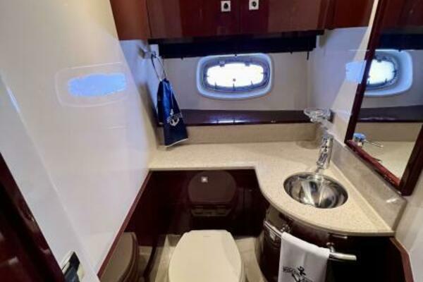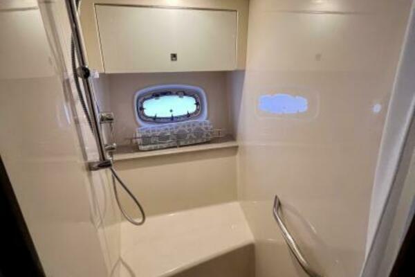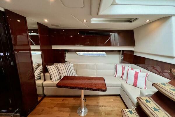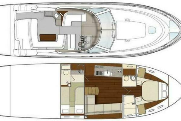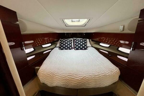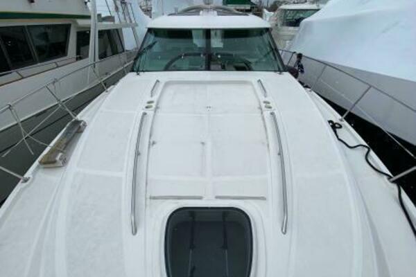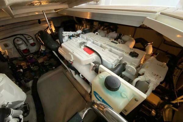 The 470 Sundancer comes standard with twin Cummins MerCruiser QSB 425 diesels (425 hp - 313 kW) mated to Zeus drives individually articulating pods that offer up to 15 percent better fuel economy and 15 percent faster top speeds than regular inboards. Plus, the Zeus-equipped 470 Sundancer provides a more comfortable ride because gear noise and vibration are significantly reduced. Optional power includes twin Cummins MerCruiser QSB 480 diesels (474 hp - 353 kW) with Zeus drives. Above the waterline, the 470 Sundancer is everything that discriminating boat owners have come to expect from the definitive express cruiser series on the water. It starts with a trademark reverse sheer line, below which are two oversize hull windows and 10 portlights. A hardtop integrates seamlessly with the windshield for the ultimate in weather protection and climate control (16,000-BTU helm air conditioning/heating is optional), yet you can still let the sun shine in thanks to two retractable skylights.