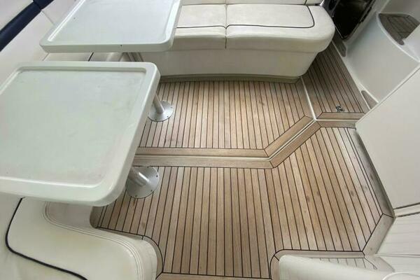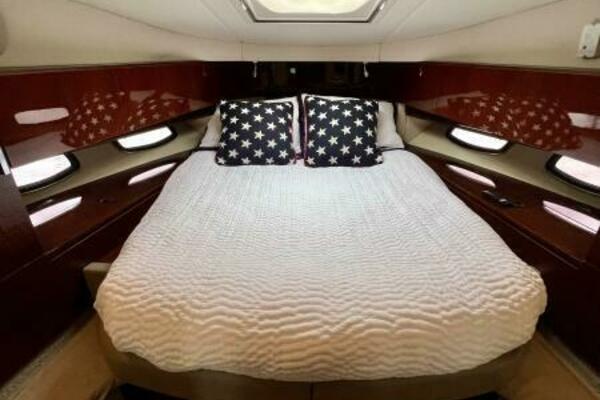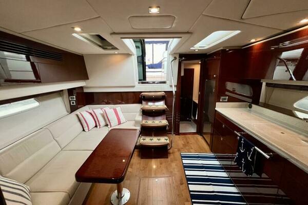 The captain will enjoy that sunny warmth from a double-wide helm seat with flip-up bolster and armrests. It slides and adjusts vertically in front of the gel-coated dash with SmartCraft VesselView Display and MerCruiser digital throttle and shift. To port, guests can lounge on the big L-shaped bench. The seating options continue in the cockpit, which boasts a U-shaped lounge flanking a convenient fiberglass table; a wet bar opposite features a solid-surface countertop, sink and icemaker or you can opt up to the removable flatscreen TV, stainless-steel barbecue grill and refrigerator.