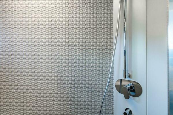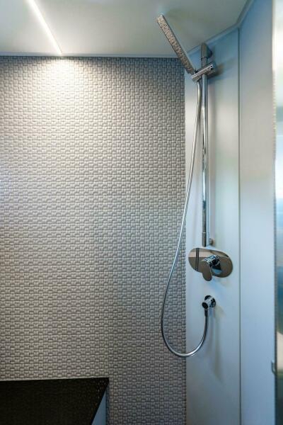 Lacquered elements, essentials, and pristine white Vescom wallpaper are used to decorate the sleeping suites. Bedspreads and cushions by Zimmer + Rhode and Casamance, in addition to a pair of decorative lamps by Cini & Nils in the master suite, complete the decoration of the first hull. The bathrooms, with ceramic top and basin, can be further equipped with decorative mosaics on the shower walls. On the first unit that was presented in Cannes, the master bathroom featured a mosaic in light grey tones called “Pulsar Chrono” by Mosaico+.