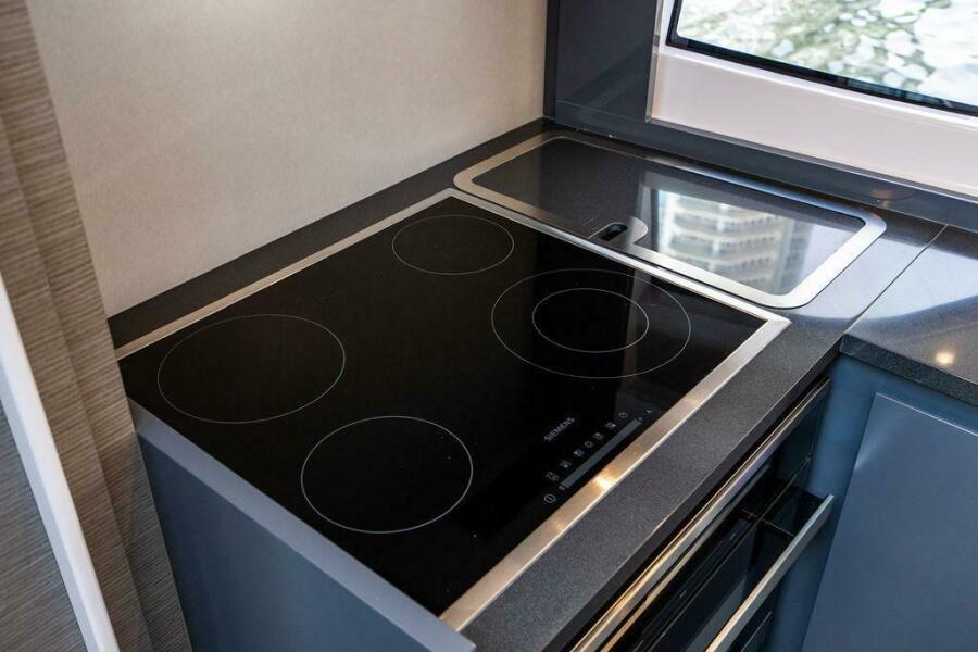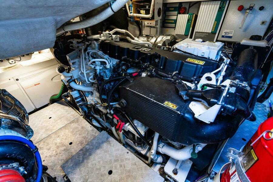 Alternatively, the owner may opt for twin CAT 12.9 engines, with 1,000 HP each, and Top System 75X surface drives (cruising speed 41 knots, maximum speed 45 knots - preliminary data), to which you can add the EASYJET system, that is usually reserved for larger vessels.