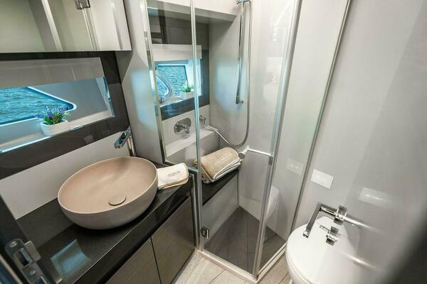 Once unfolded and covered with a cushion, the “C-shaped” sofa is transformed into a comfortable sofa bed. Two additional fixtures by Fontana Arte complete the decorations of the lower deck. Upon the owner’s request, the dinette can be replaced by a third cabin with bunk beds or a crew cabin. If the latter is selected, it can be accessed from the outside, through the deck, to ensure maximum privacy for guests.