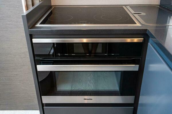 The kitchen’s Cantalupi LED fixtures illuminate its beautiful Corian Anthrachite surface. The same material is used on the table top of the dinette, which is built around a foldable table that is available upon request.