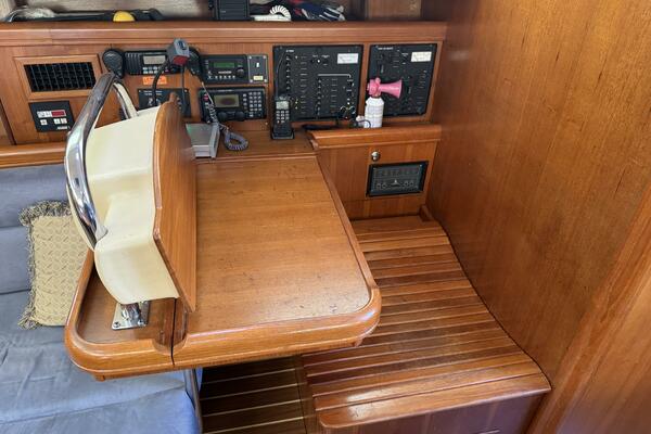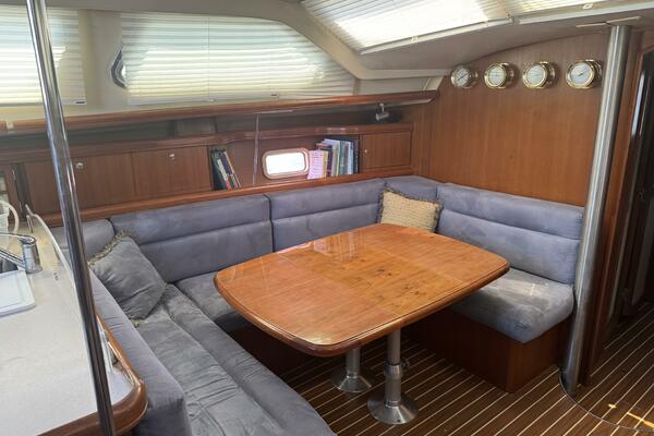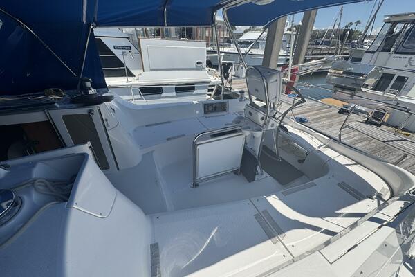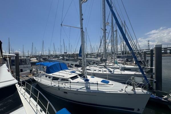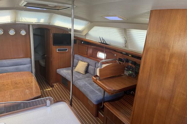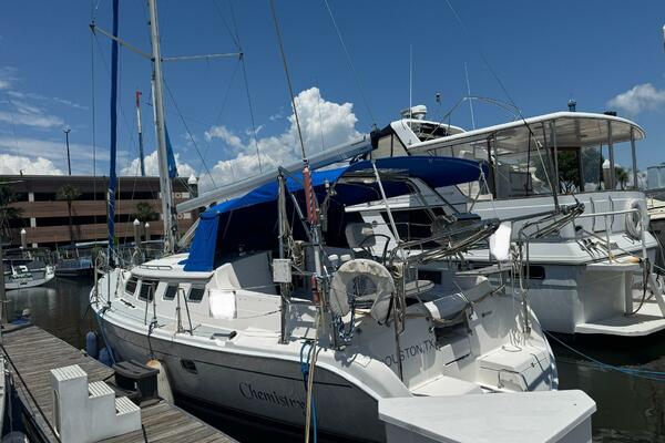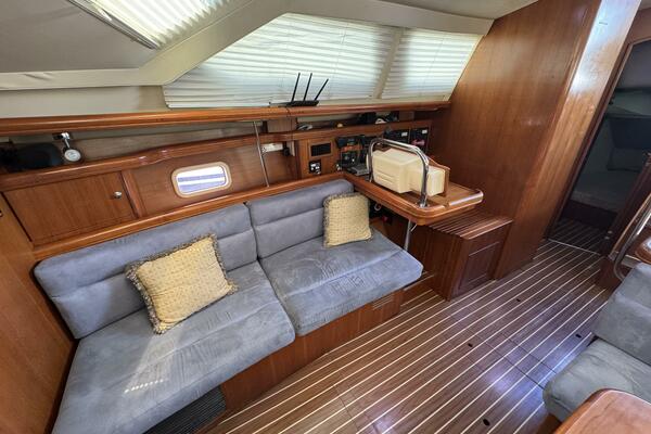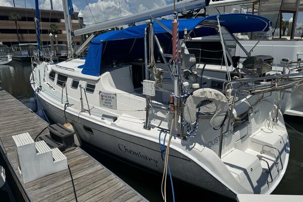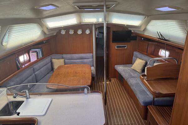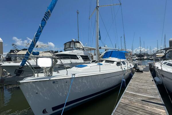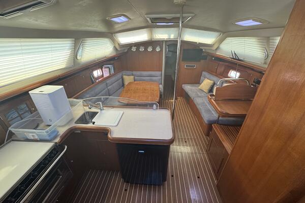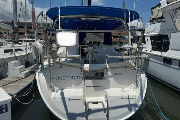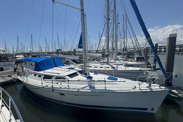 The Hunter 44 Deck Salon features spacious accommodations generally seen only on much larger vessels. The hull sports a unique "bow hollow" forward, creating a longer waterline for increased lift and speed. The underbody aft also has a stern reflect for a flatter exit, resulting in enhanced stability and reduced wake characteristics. The Hunter 44 Deck Salon offers an extremely comfortable living space, featuring swing-out companionway doors to the interior, upholstered salon settees and a high-gloss dinette table big enough to serve the whole crew. A stainless steel refrigerator/freezer highlights the galley. A master cabin with V-berth forward, two guest cabins aft, and two separate heads round out this inviting interior.