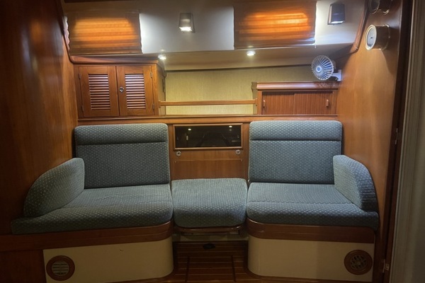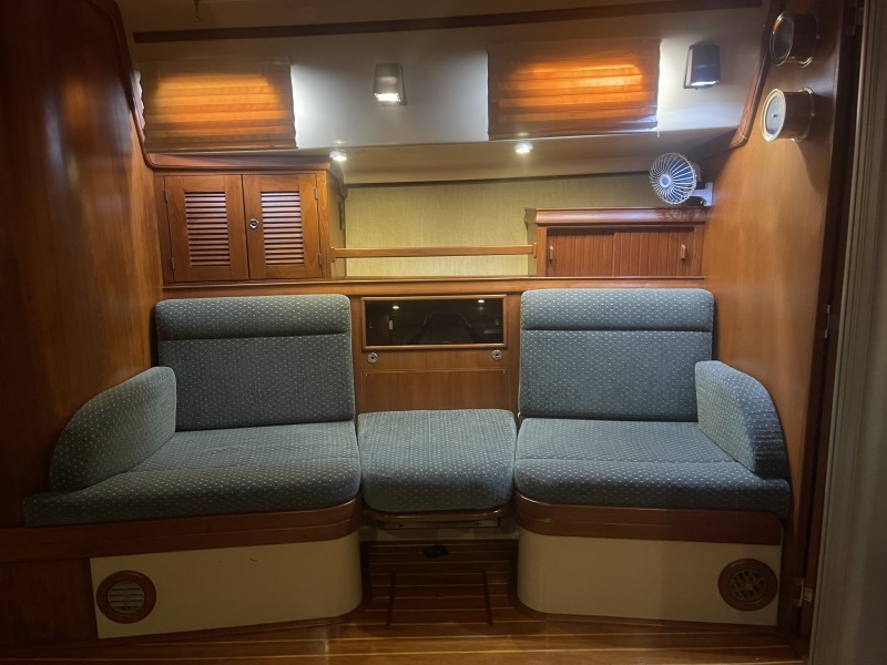 - Two comfortable captain's chairs to port. The captain’s chairs are separated by a fold-up table that can connect the chairs into a full settee.