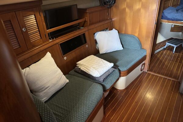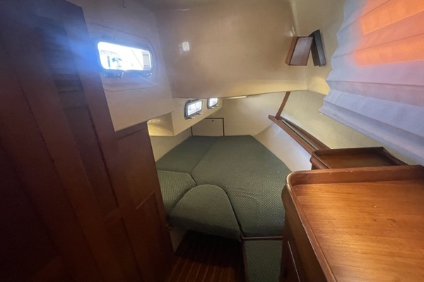 - Master Cabin: The forward stateroom has a double Pullman berth to Starboard that has been converted to a King Size V-berth. There are teak shelves outboard of the berth, storage lockers, and cedar-lined drawers underneath.