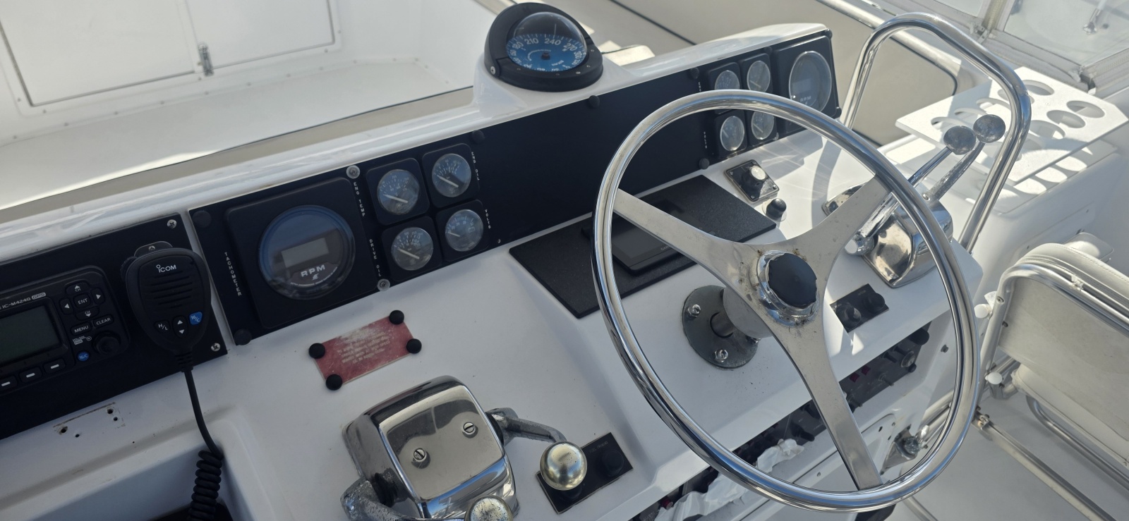 - Helm & Controls: Twin engine controls configured with Throttles to Port and Shifters to Starboard of the wheel.