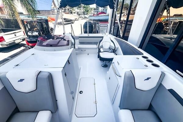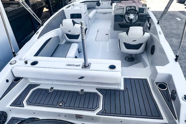 This 2022 Starcraft SVX 231 OB DH features silver upholstery and provides a black Bimini top for sun protection. This versatile deck boat has something for everyone, whether you prefer water activities, cruising, or just sitting on the sandbar.