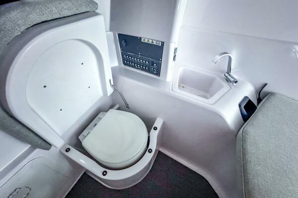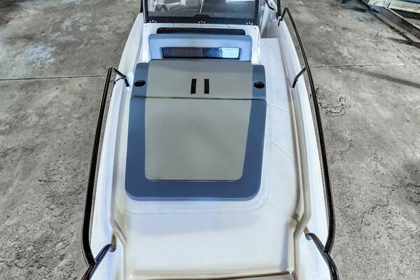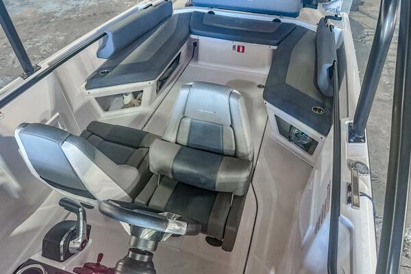 The helm is equipped with bow thruster, chartplotter Simrad NSS 12", Echo Sounder through hull, trim tabs, Steering console switch panel, and USB charging port. The wide helm console and front screen offer a helm seating area with more space and room for step through entrance to the front cabin in style.