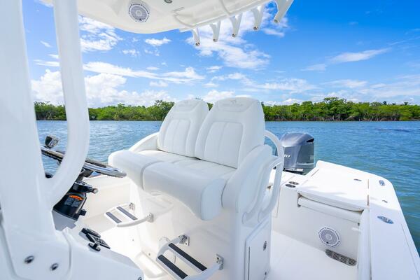 - Upholstered Helm Seating for Two with Flip-up Bolster, Individual Footrests, Seatback Rocket Launcher, (2) Cupholders, 32 gal Livewell and Tackle Storage
