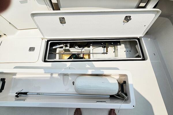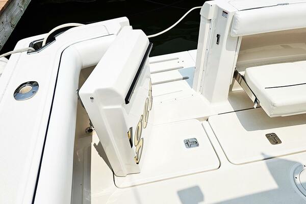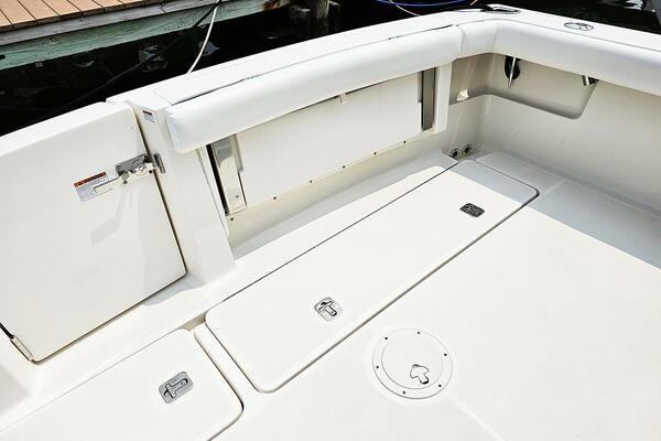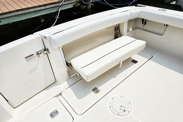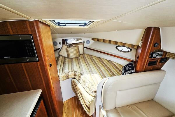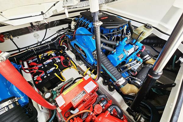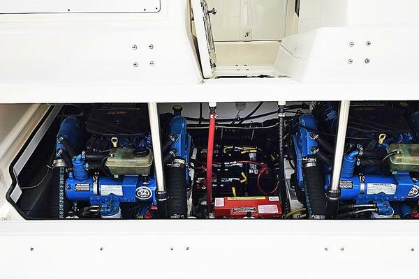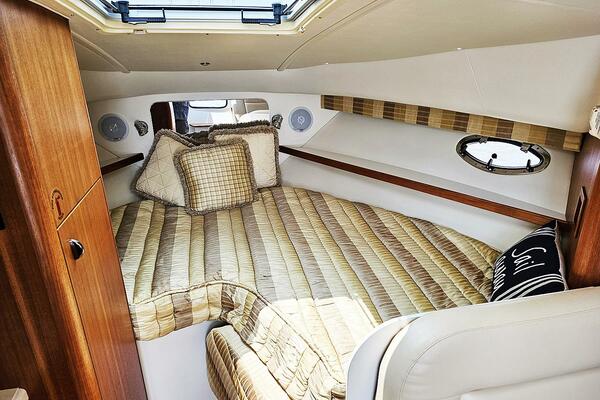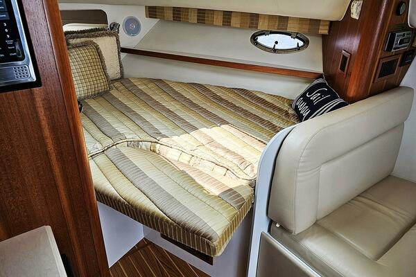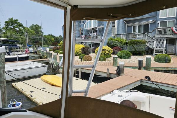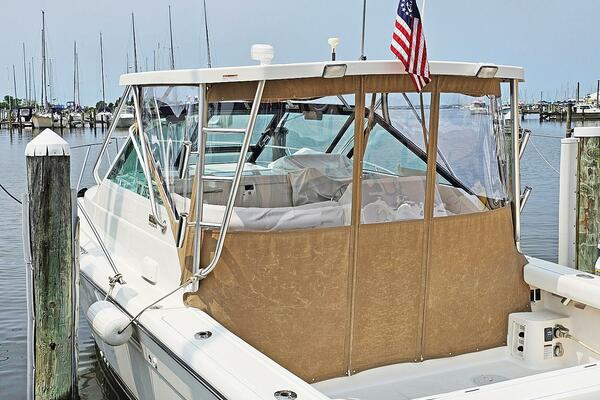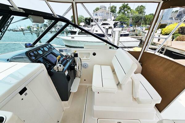 As you step aboard from the transom onto a large swim platform you will note a covered folding swim ladder (nothing to trip on), next your entry into the cockpit is through large double wall transom door. The aft section of the cockpit is large and open with a fold away transom wall seat, full coaming bolsters and two in floor storage lockers with lift out liners providing excellent access to the mechanicals beneath. A small step up into the enclosed cockpit / helm area (new enclosure with Stata-glass). This deck section lifts electrically for engine and generator access. There are several notable features which include a high wrap around windshield with opening center section and aluminum frame, fiberglass hardtop with a large tube polished aluminum frame, L-shaped settee on port side and helm seat on starboard with an aft facing jump seat. There are also individual covers for all seating when not in use.