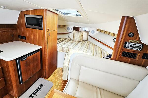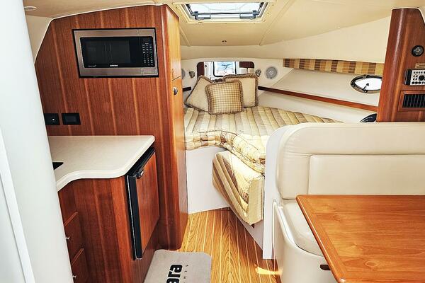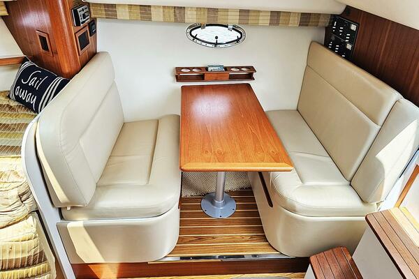 Opposite the galley on starboard is the dinette with a beautiful large teak table and bench seating covered in a light beige ultra leather. This table can be lowered to create a sleeping area. Stereo and electric panels are also conveniently located in this area.