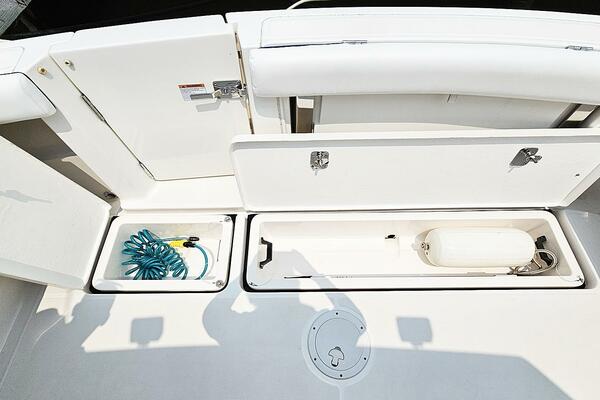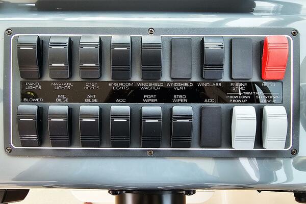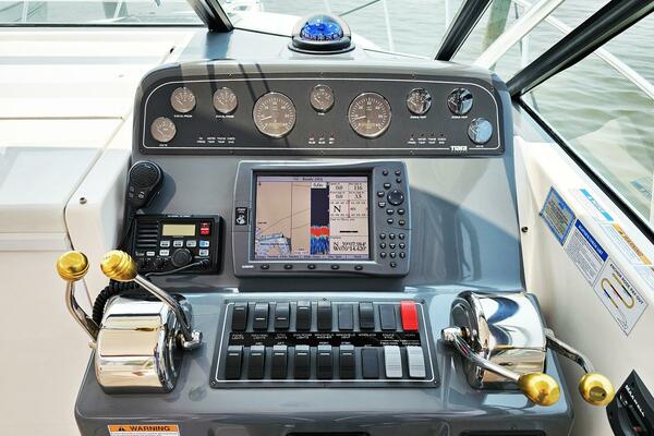 The helm includes all of the expected controls as follows: a full set of analog gauges for the engines, dual lever shifter and throttles, Garmin chartplotter with fishfinder, ICOM VHF, compass, miscellaneous switches for lighting.