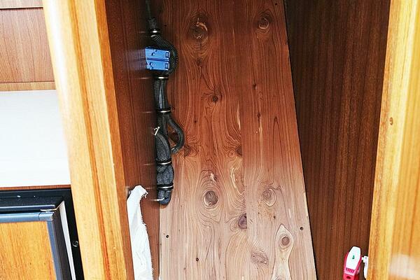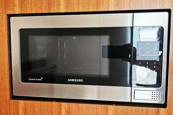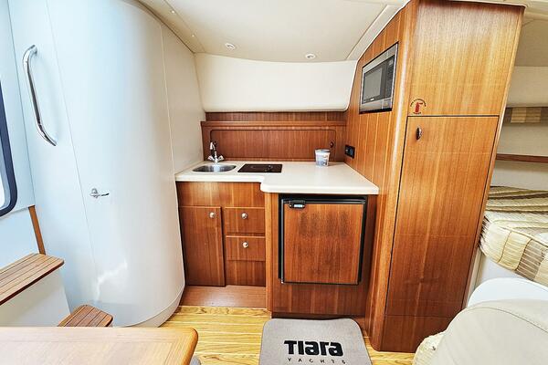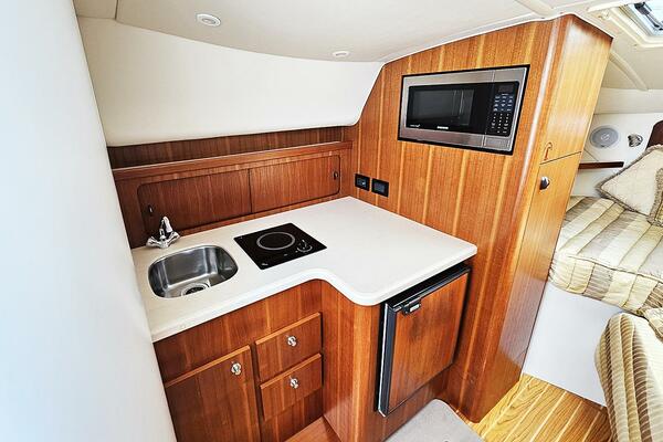 Forward of the head on the port side is the galley, with beautiful off white Corian counter top with storage both above and below.. For cooking there is a one burner electric stove top and a built-in Samsung microwave / convection oven, for clean-up a stainless steel sink, for your cold food a refrigerator. Just forward of the galley is a large hanging locker.