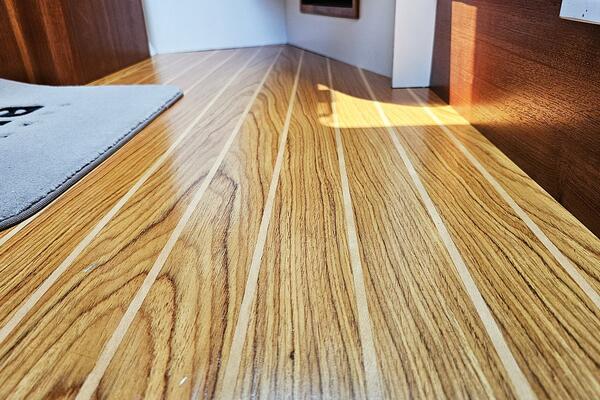 Now, lets step below. There is a nice wide bi-fold companionway door with two wide teak steps. Once below you are greeted by a beautifully appointed cabin, bright and airy and free of numerous bulkheads that would make the space feel confining.