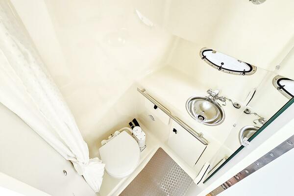 To port is a curved door providing access to the head. This is a comfortable size and more than adequate on a boat of this size. The cabin is one piece molded white fiberglass with all corners being rounded making for greater comfort when at sea and much easier for cleaning. There is an electric toilet, stainless steel sink and vanity with storage below and a pull out shower head.