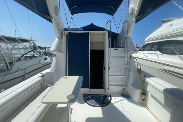 One of the defining traits of this Bayliner 288 is its excellent use of space. Every nook and cranny has been utilized to maximize storage and usability, with features that make entertaining as easy as navigating. The cockpit, located aft on the lower deck, provides an ideal platform for fishing, lounging, or setting up an alfresco meal. With its molded swim platform and integrated swim ladder, access to the water is both safe and seamless.