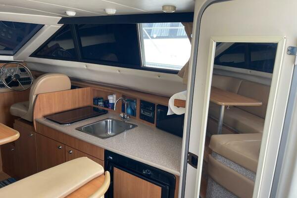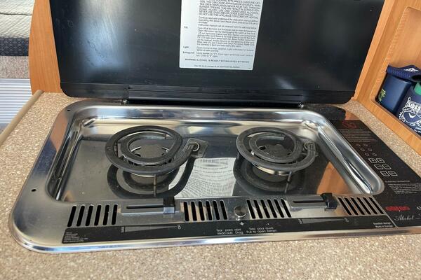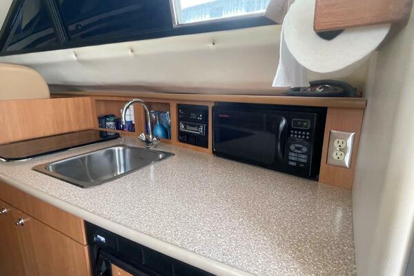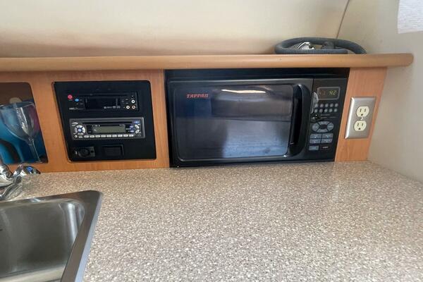 - Well-appointed galley with electric stove top, microwave, large fridge with freezer and great storage