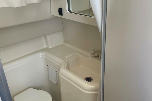 Forward, the private stateroom features a V-berth with plush cushions and ample storage. A second mid-cabin berth below the salon adds even more sleeping accommodations, making overnight cruising with family or guests convenient and comfortable. The enclosed head offers an electric marine head, and sink—everything you need for multi-day adventures without compromising personal care.