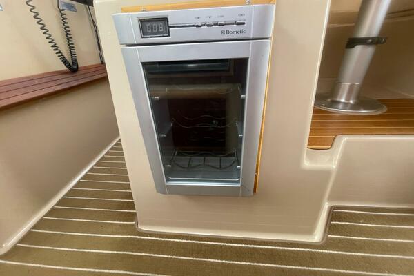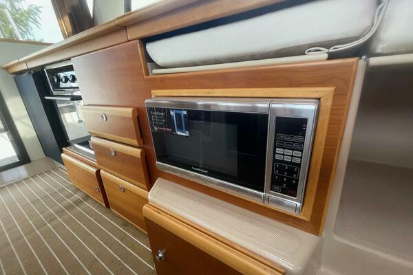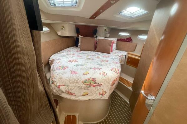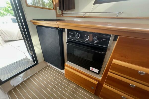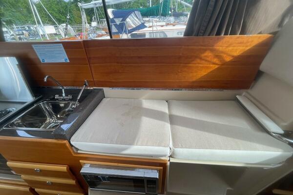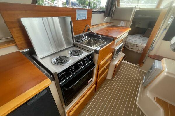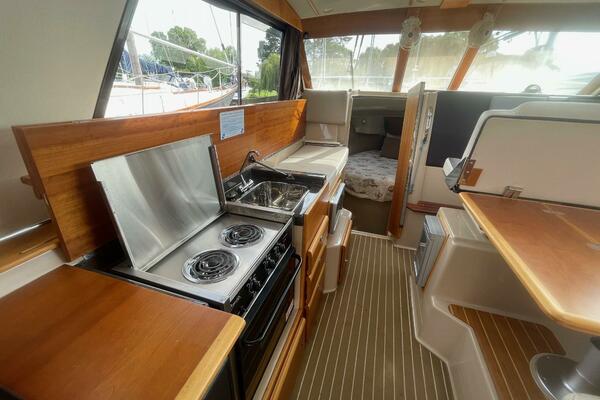 Inside, the layout is thoughtfully designed to maximize comfort and functionality. The bright salon features panoramic windows, a convertible dinette, and a fully equipped galley with a propane stove, oven, and refrigerator/freezer combo—perfect for entertaining or preparing meals on the go. The forward stateroom offers a cozy queen berth, while the mid-cabin converts to additional sleeping space, accommodating up to six guests with ease.