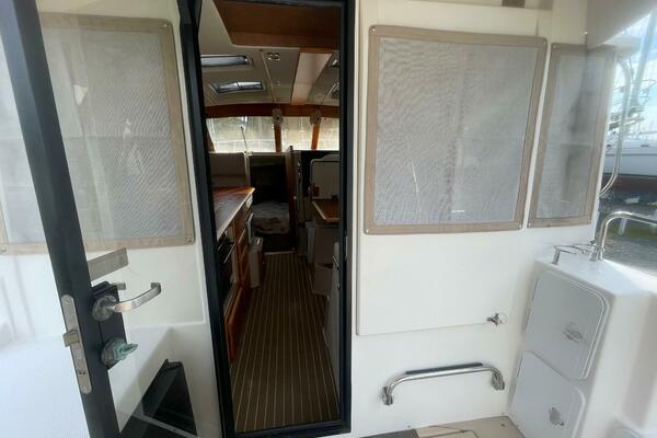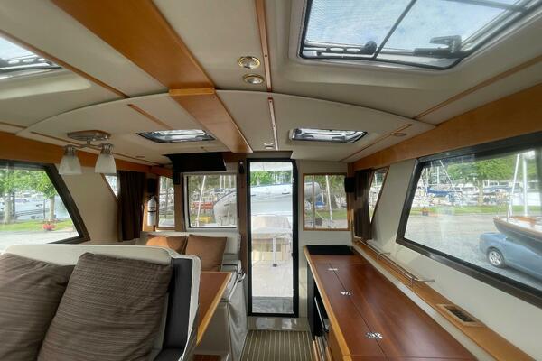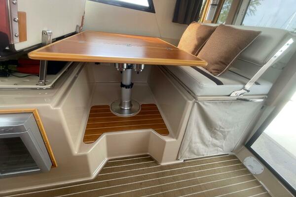 On deck, the versatility continues. The spacious cockpit includes a retractable sunshade and swim platform with a boarding ladder, ideal for relaxing, swimming, or fishing. The foredeck features cushioned observation seats and a central lounge, offering a serene spot to enjoy the view.