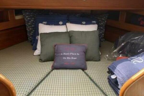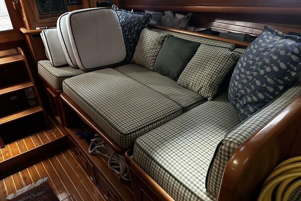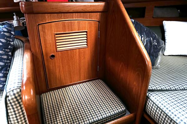 Port side: Next aft to port is a large hanging locker and seat, with 3 drawers beneath, followed by a comfortable, raised dinette, with more storage outboard and beneath. The dinette converts into a nice double berth.