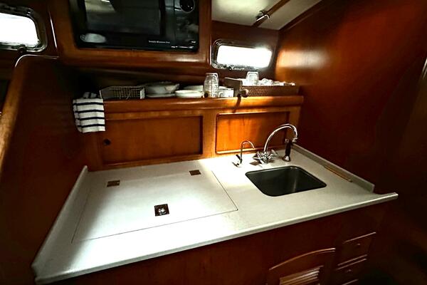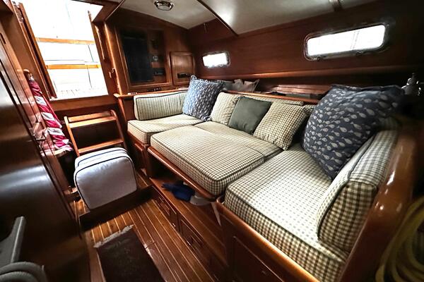 The large cockpit, with deep coamings, teak decking, steps to the side decks, 2 comfortable transom seats with backrests, and a centered transom door, is sure to be the place for family and friends.
