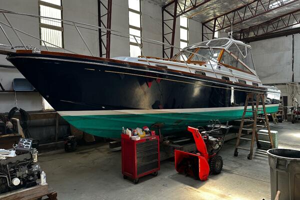 Interior is finely crafted old growth teak, with a fine satin varnish finish.