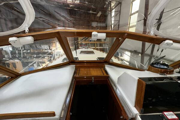 The entire bridge deck can be fully enclosed by the bimini, top, side curtains, and rear drop curtain. A truly flexible arrangement, adjustable to any weather condition.