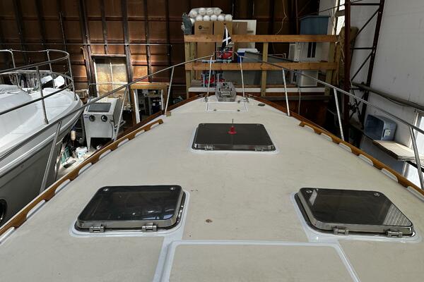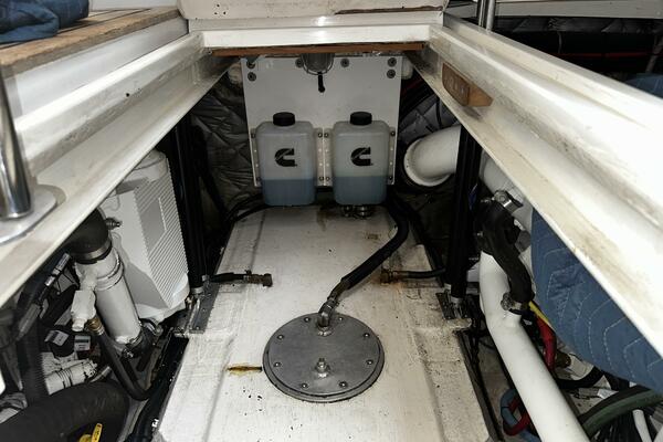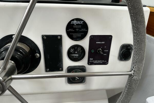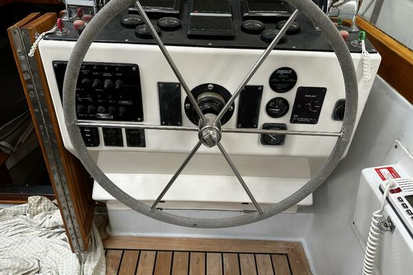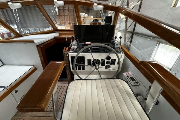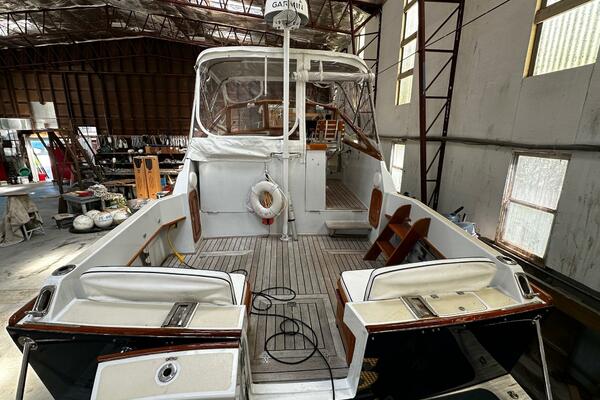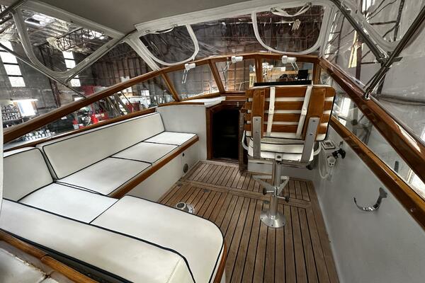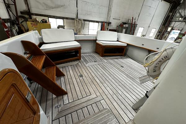 Raised bridge deck provides an L shaped settee with space for 6, to port. And, the helm station with captain's chair, electronics, engine controls, and gauges. Teak decking provides a nice touch, and provides good footing. Wet bar with ice box and teak storage boxes for added convenience.