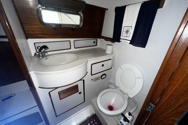 Starboard side: Galley with sink, large refrigerated ice box, microwave oven, shelf, locker, and 3 drawers. Then head compartment with separate shower.