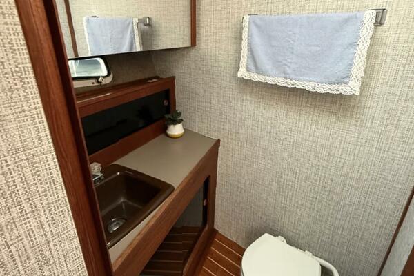 With the extra stateroom and head bring along company. Engine room is easily accessed from the cockpit with a separate entry door.