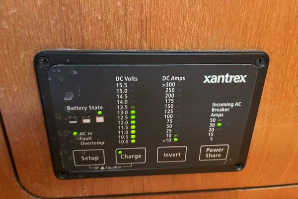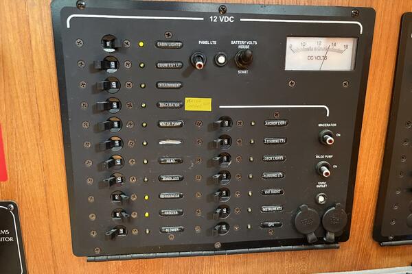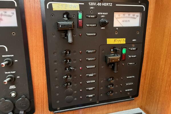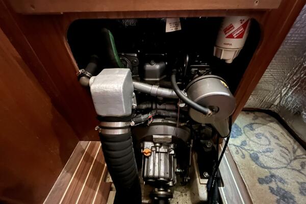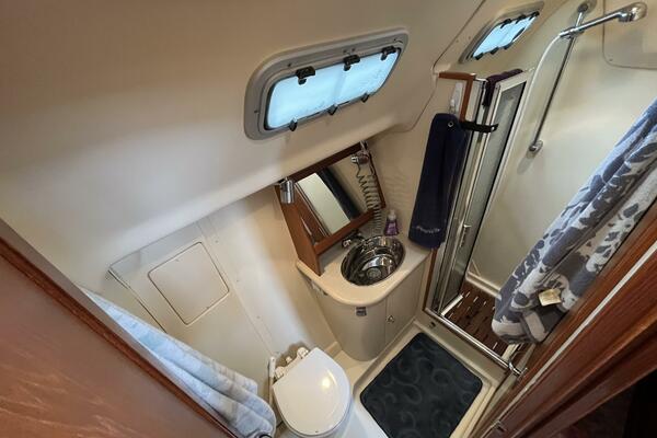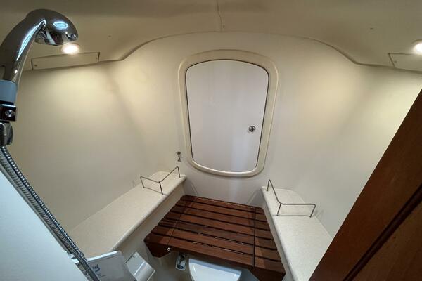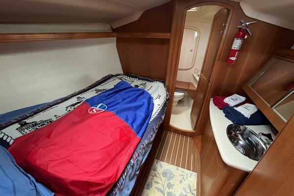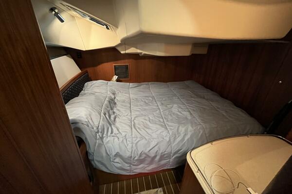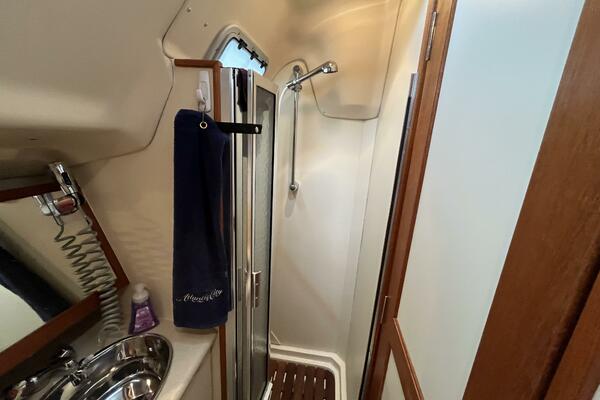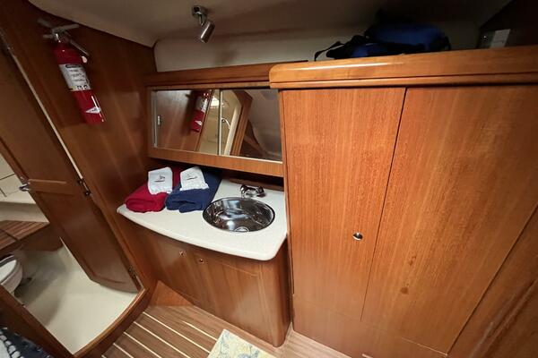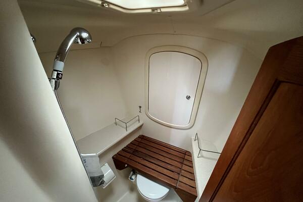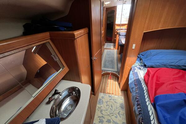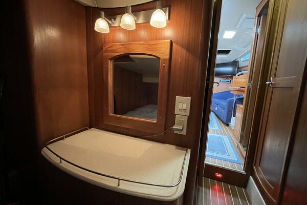 To starboard is the navigation station with a proper nav desk and access to all systems breakers and tank monitors. A VHF station is also located here, as is storage for any number of charts, books, and tools one will need aboard. Aft of the nav station is a spacious day head with separate shower, electric flush toilet, and private access to the aft stateroom. This can be configured as an owner's cabin since another stateroom and head are forward! The aft cabin is a full-beam master stateroom with an athwartships queen berth, generous storage, a mirrored vanity with Corian countertop, and engine access.