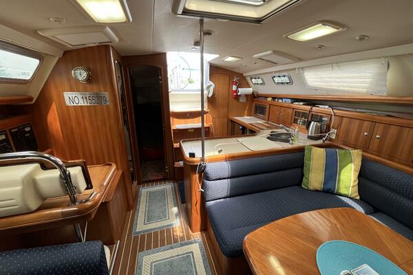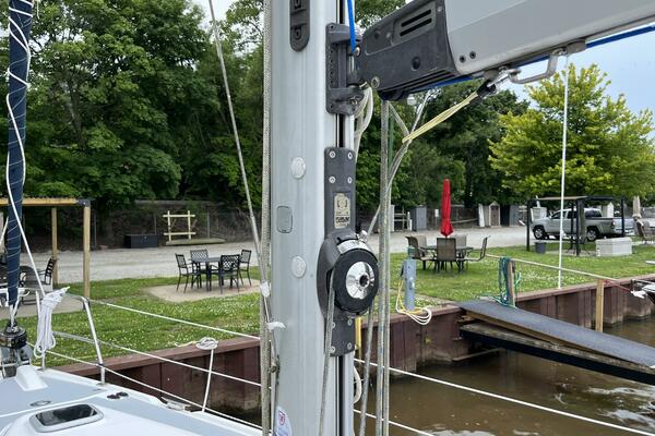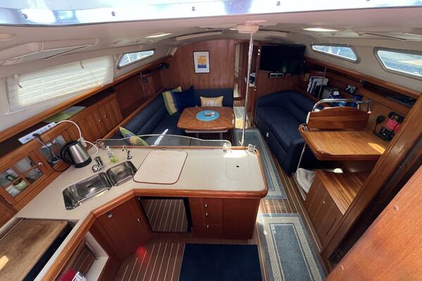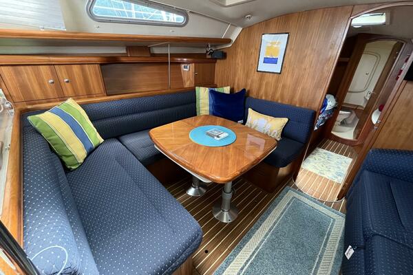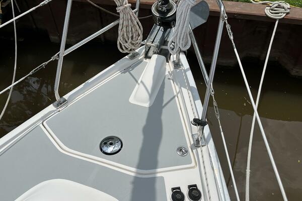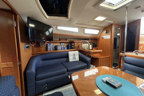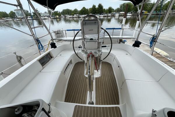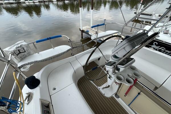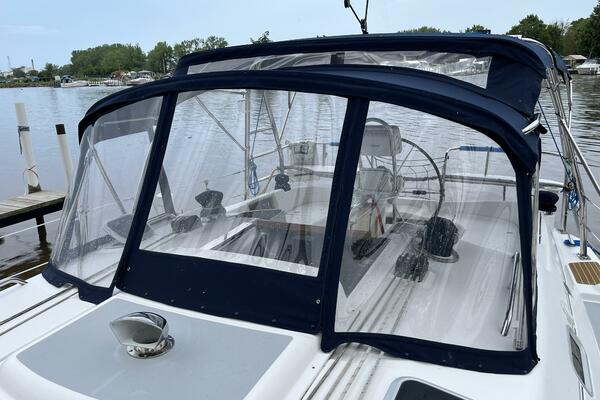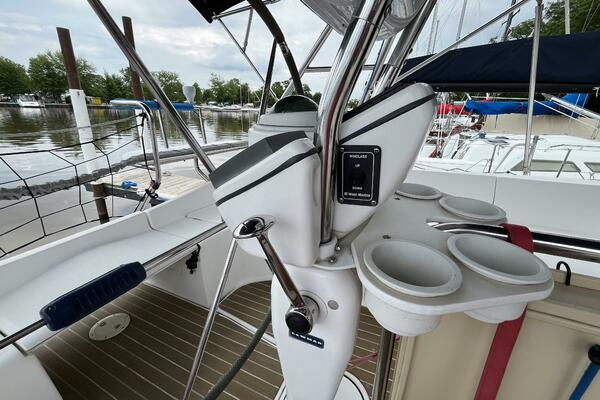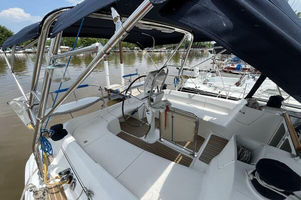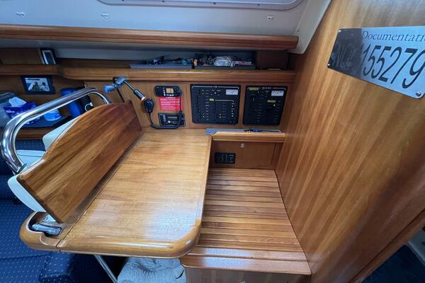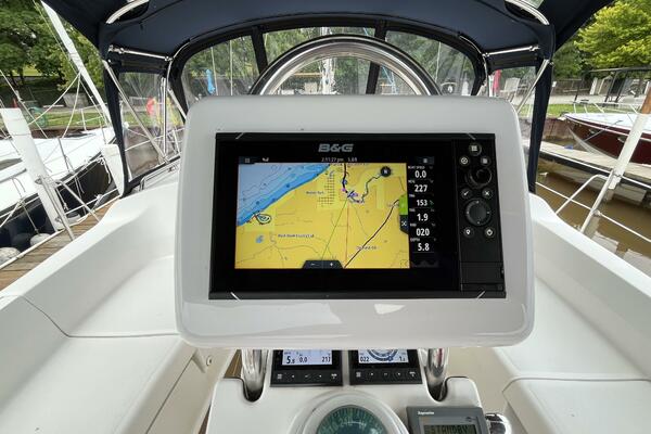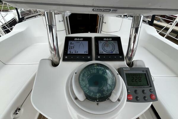 All lines lead smartly aft to the cockpit with no need to go forward for reefing or setting sail. The furling mainsail and jib are ideal for single handed or short handed sailing, and without a backstay, the B&R rig maximizes sail area and minimizes sail handling. This affords a measure of performance that will appeal to sailors who demand a reasonable turn of speed. An electric windlass at the bow and powerful Lewmar self-tailing winches in the cockpit make light work of anchoring and sail trim. The cockpit is well protected with a full canvas dodger, bimini, and connector, all custom made in 2023. Recently upgraded electronics, featuring a B&G Zeus plotter, B&G Wind, and Triton multi-function display accompany the Raymarine autopilot at the helm station NavPod. Underfoot, the cockpit and swim platform has been updated with NuTeak synthetic decking--easy on the feet on hot days and simple to maintain.