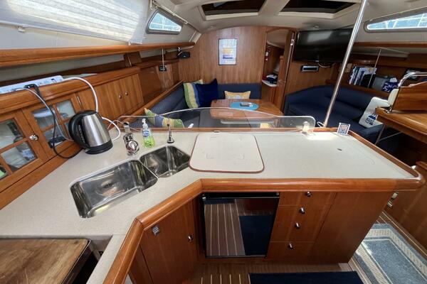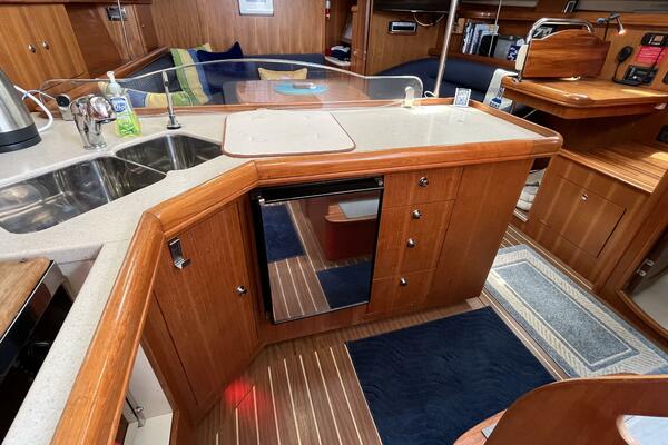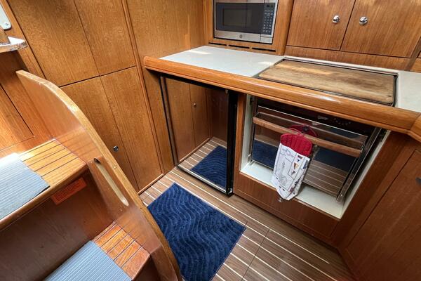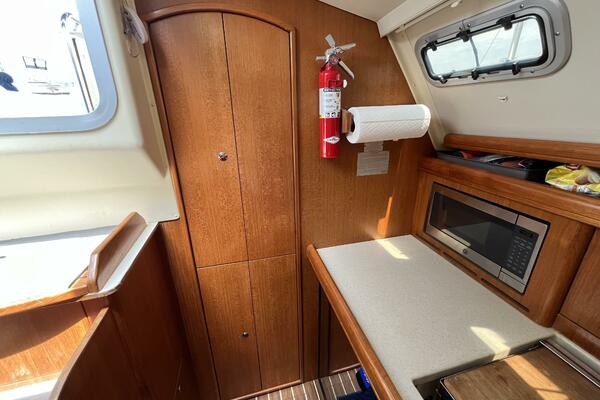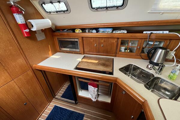 Stepping below into the bright and airy salon feels open and spacious, and surrounds you with rich wood finishes. Wraparound windows bring in tons of daylight around the convertible dinette, and taller sailors will love the extra headroom--well over six feet! A fully equipped galley to port includes two refrigerator/freezer units, Corian countertops, a double stainless sink, microwave, and propane galley stove/oven. A clever pantry is built into the aft bulkhead and has plenty of storage for spices and provisions.