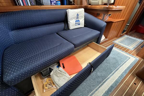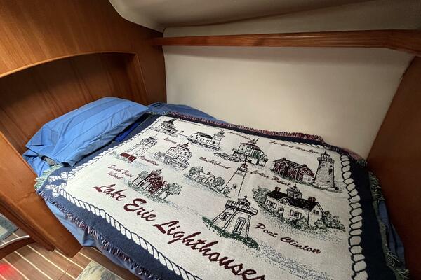 Moving forward to the main salon, access to ship's systems and bilges is simple. Tasteful upholstery is richly padded and comfortable, and an additional queen berth can be configured. A 32" flat panel television and Bose speakers add to the entertainment options. A few steps forward is the private guest cabin. This cabin features a double sized Pullman berth, a vanity with sink, and separate and very large head and shower compartment.
