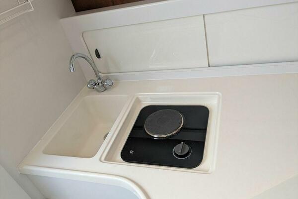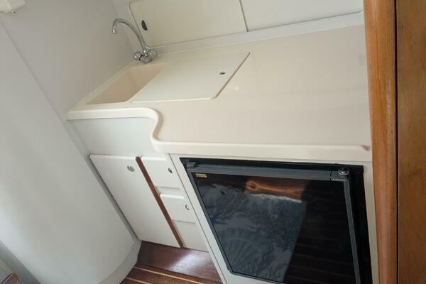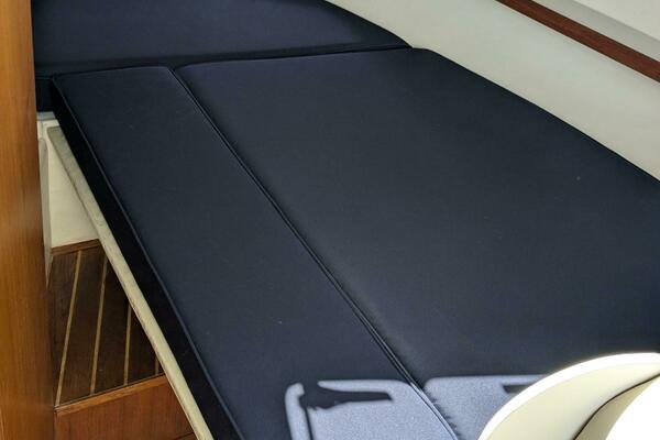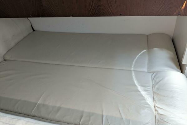 The forward berth cushion and insert are newly upholstered in 2025. Both of these berths can comfortably accommodate up to 4 adults. To port is a well laid out galley with plenty of storage and an enclosed head. All new LED lighting (2025), 4 new thru-hull opening portholes and newoverhead hatch with screen (2025).