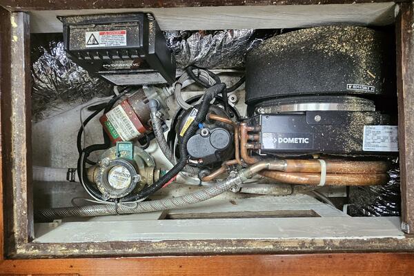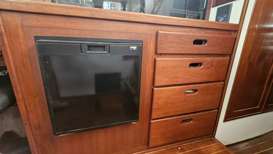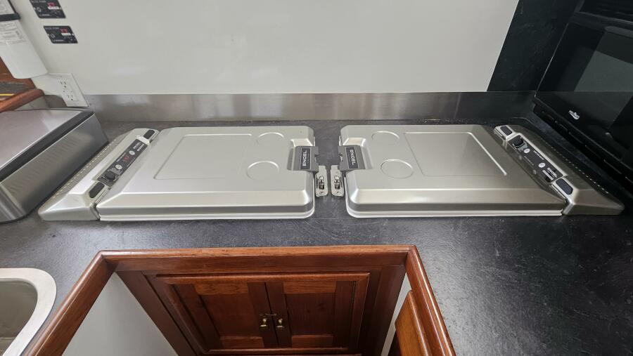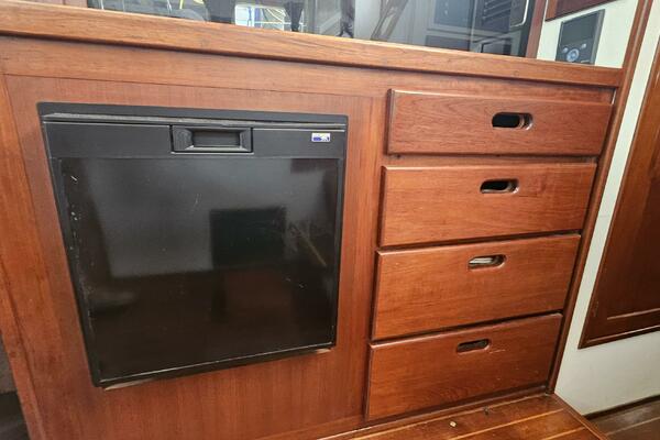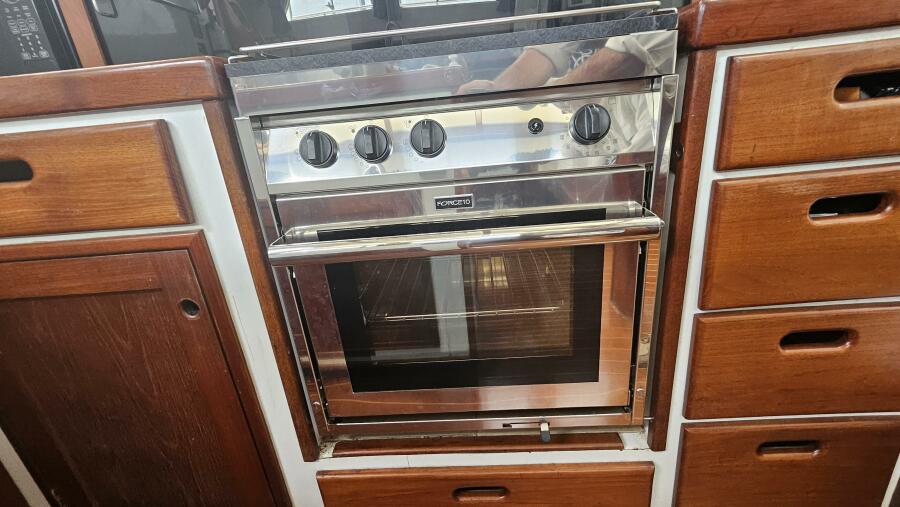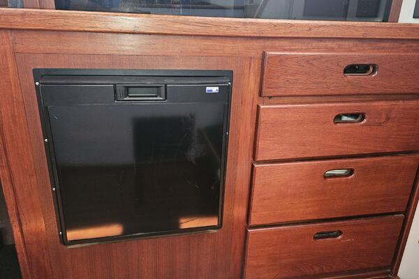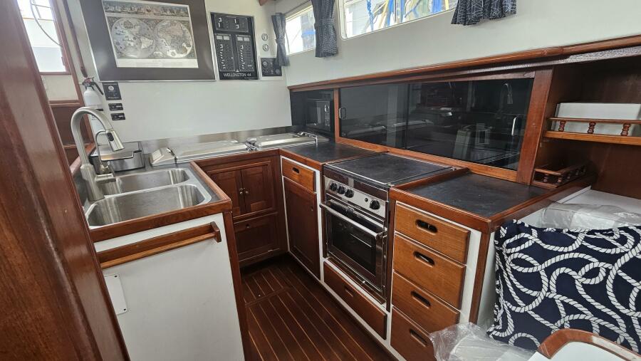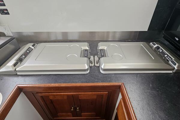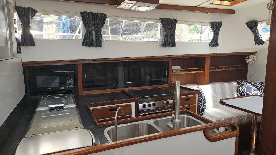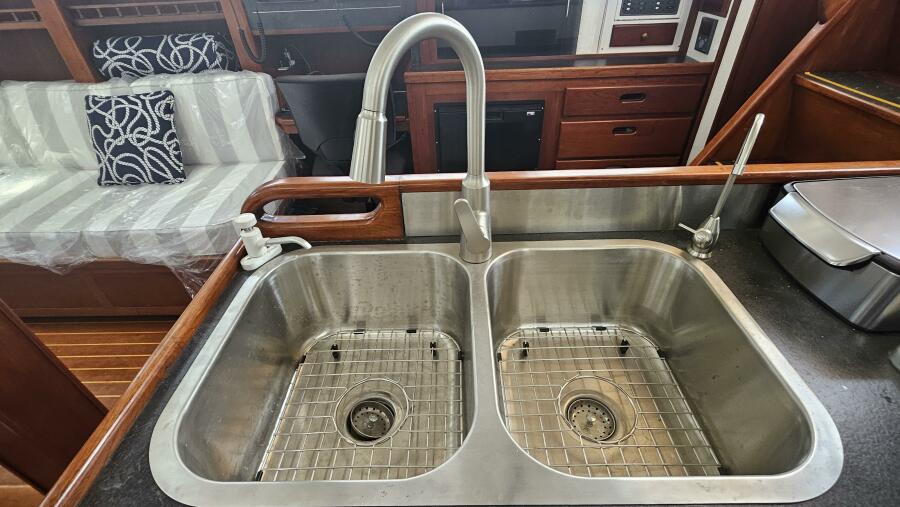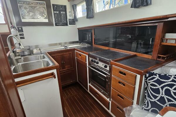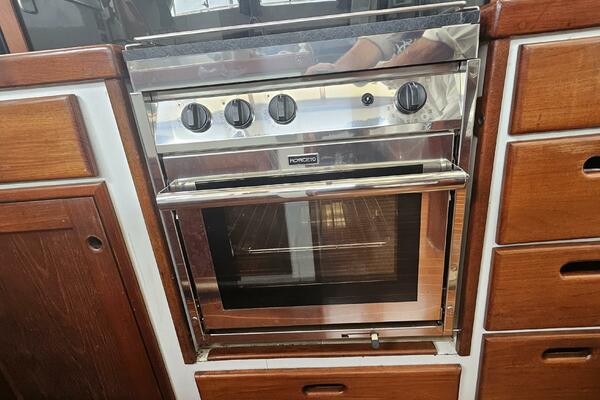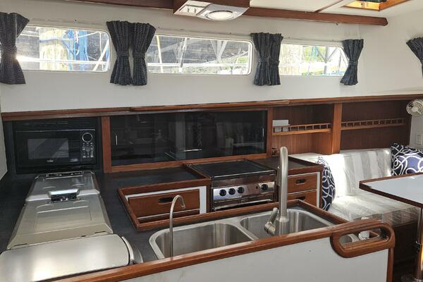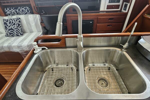 - Galley: The U-shaped galley is located aft of the dinette and is designed for safe and comfortable cooking while cruising. It includes a new gimbled Force 10 propane stove and oven, Two Engel top-loading refrigerator/freezers with third Norcold refrigerator/freezer across from galley. Double stainless steel sink with R/O, tank, and saltwater faucets.