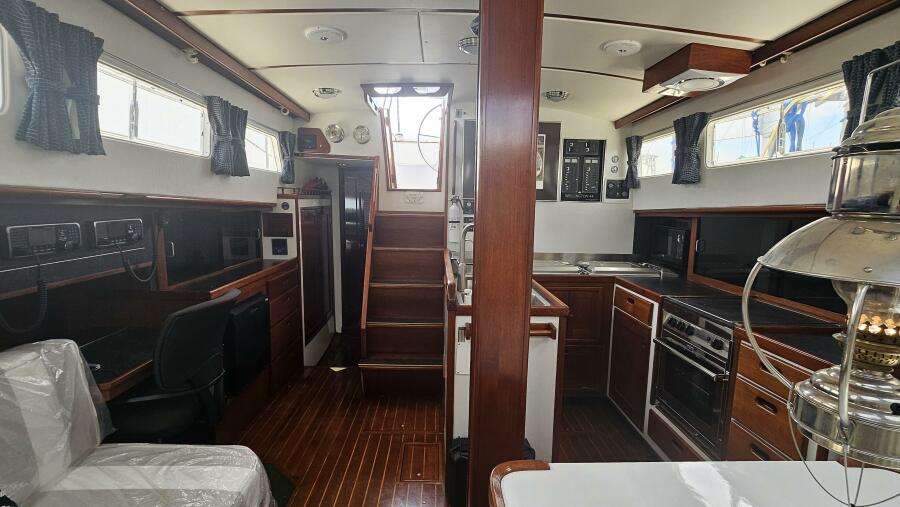 - Aft companionway: A starboard companionway with hanging locker for foul weather gear and potential work bench leads from the salon aft toward the master stateroom.