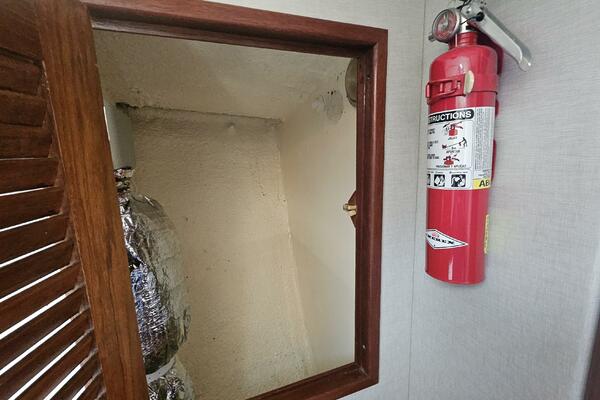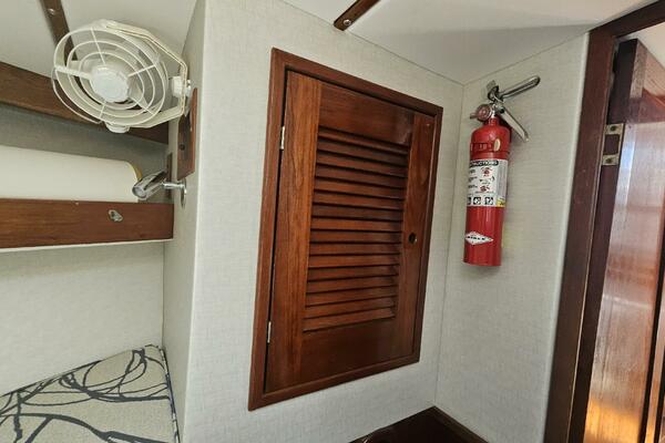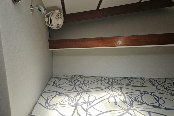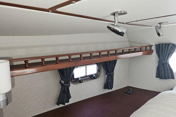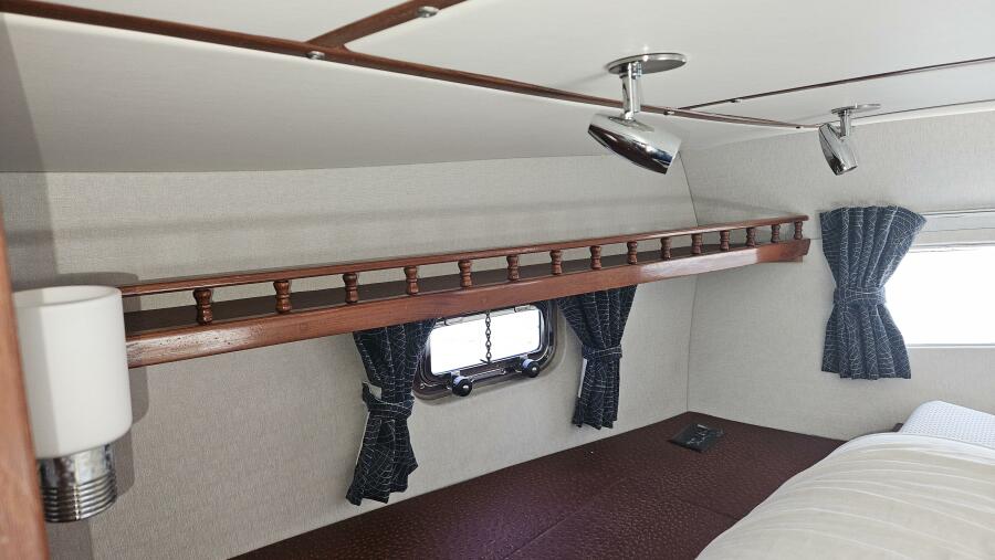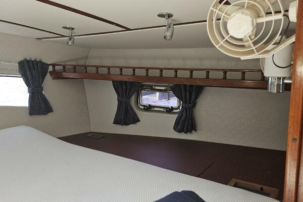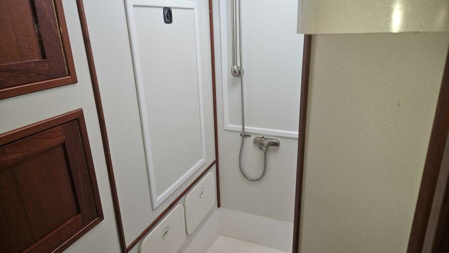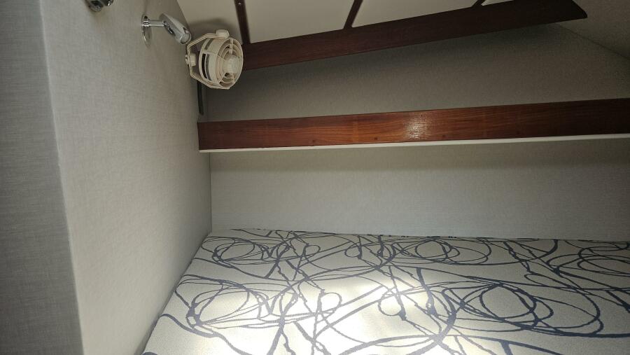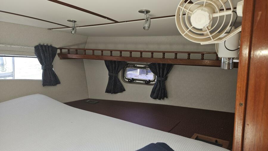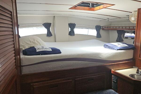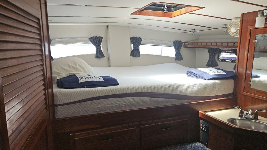 - Master stateroom: Occupying the boat's full beam, the spacious master cabin features an athwartships ventilated queen berth, ample storage lockers and drawers, a private ensuite head and separate walk-in shower stall.