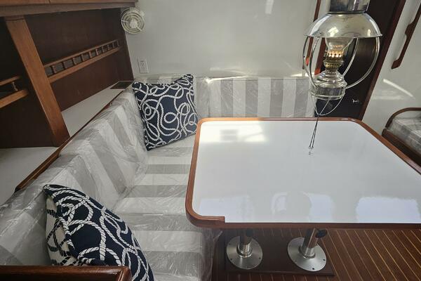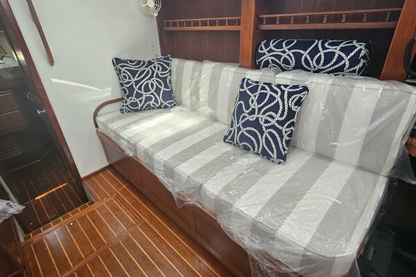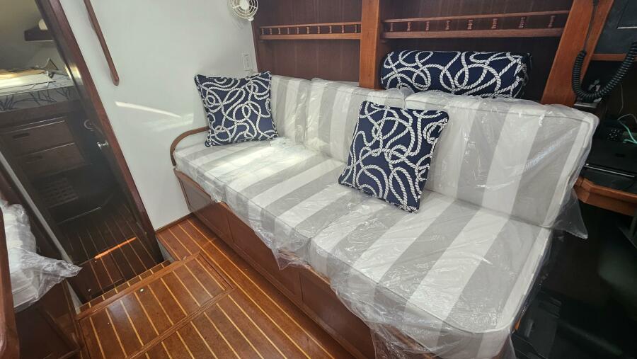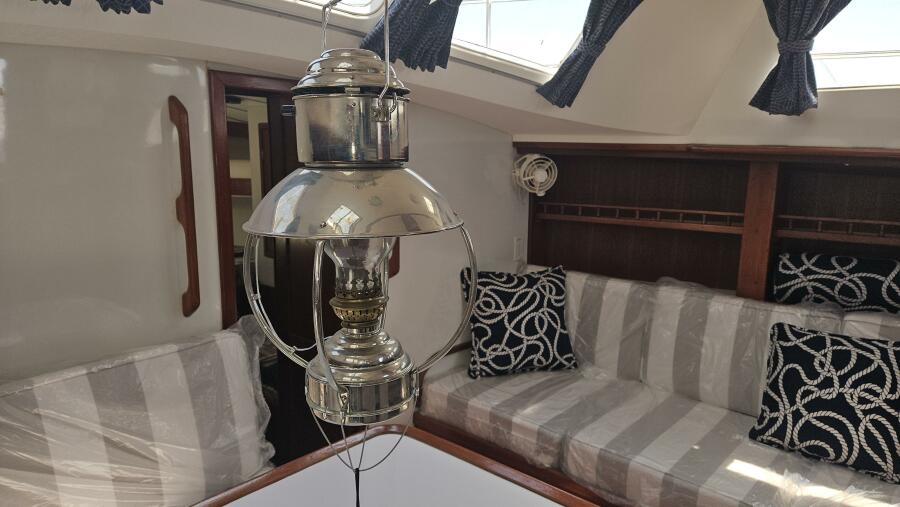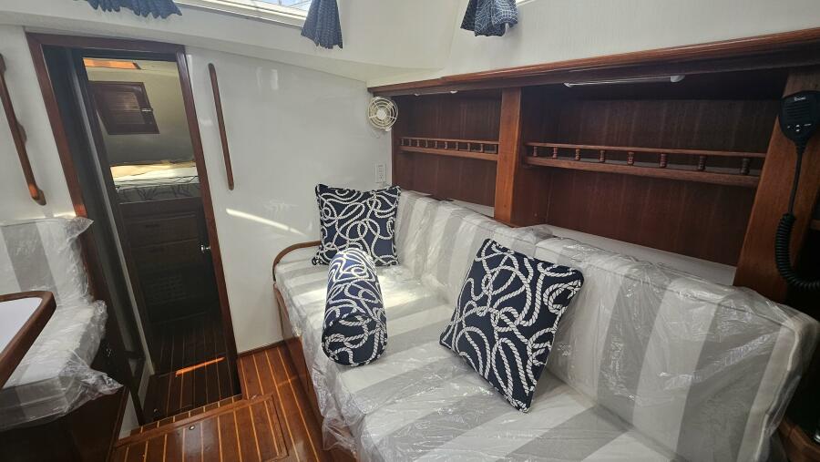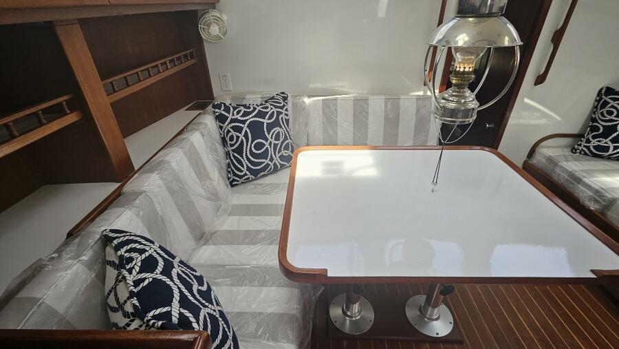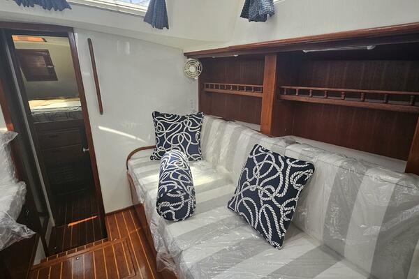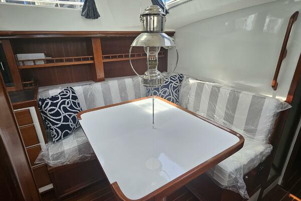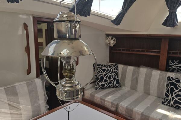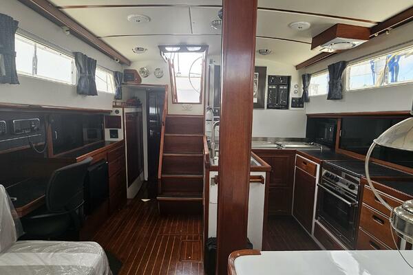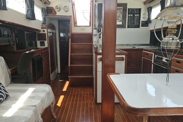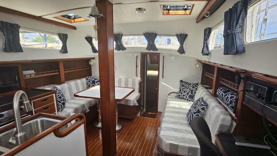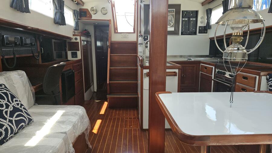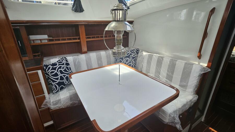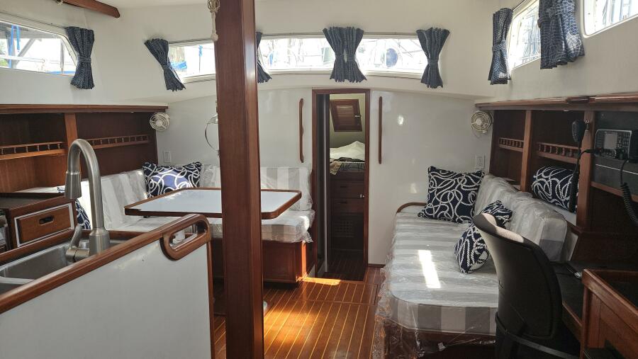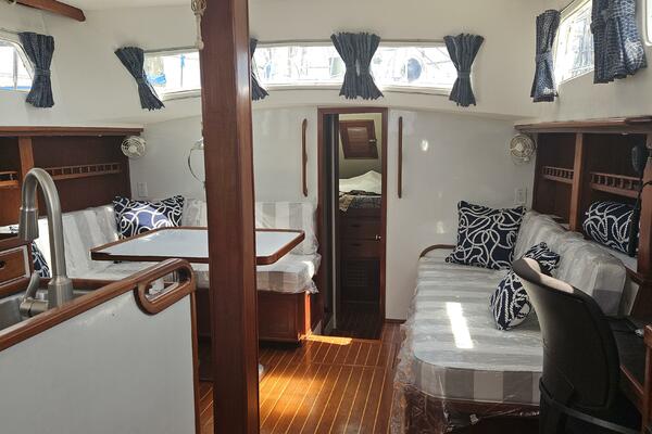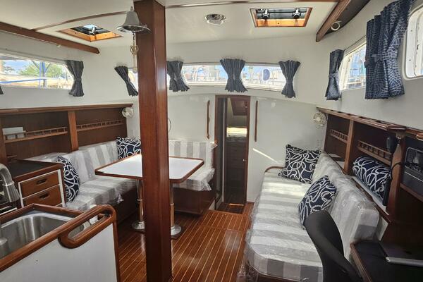 - Main salon: Entering the salon from the cockpit, the area is bright and airy, thanks to large extra thick (9/16" Lexan) fixed portlights. It features a large U-shaped dinette to port and a navigation station and pilot berth to starboard. Well crafted interior mahogany woodwork, including a refinished teak and holly sole.
